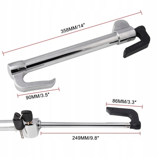 Sposób użycia: 1. Włóż klucz do cylindra blokującego i obróć go na 2. Dostosuj długość zamka (w zależności od odległości między kierownicą a sprzęgłem) i zahacz sprzęgło (przepustnicę lub hamulec) 3. Umieszczanie następnego haka, aby zablokować kierownicę 4. Wyjmij klucz i dokręć zamek, czyli koniec. uwaga Nie obsługi pojazdów, których szerokość krawędzi przekracza 3 CM.