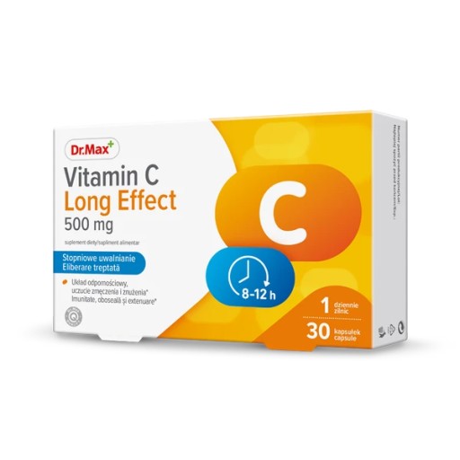 Vitamin C Long Effect 500 mg Dr. Max, 30 kapsułek to suplement diety zawierający nowoczesną formę witaminy C, która dzięki umieszczeniu w specjalnej kapsułce jest uwalniana stopniowo przez 8 do 12 godzin.
