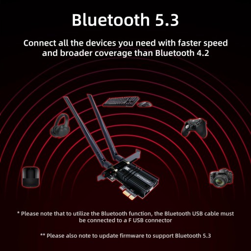 - 【Bluetooth 5.3】 Karta Wi-Fi PCIe z Bluetooth 5.3 zapewnia 4 razy większy zasięg w porównaniu z BT 4.2, 2 razy większą prędkość transmisji, co zapewnia szybszą transmisję, co zmniejsza całkowite zużycie energii. Silna energia i ciągła praca mogą być idealnym wyborem do domu dla słuchawek dousznych, słuchawek, klawiatur, myszy itp. BT TWS, zapewniając większą wygodę i potrzeby komputera stacjonarnego. *Pamiętaj, że aby móc korzystać z funkcji Bluetooth, kabel USB Bluetooth musi być podłączony do 9-pinowego złącza F_USB