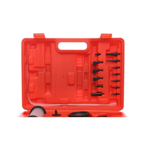 Wykonana z solidnego metalu i trwałego tworzywa sztucznego, pompka KD10515 gwarantuje długotrwałą wydajność. Zestaw zawiera praktyczne akcesoria, takie jak zbiornik płynów, różne przekroje węży winylowych, adaptery, podstawki, osłony i przyssawki, co czyni go kompletnym rozwiązaniem dla każdego warsztatu
