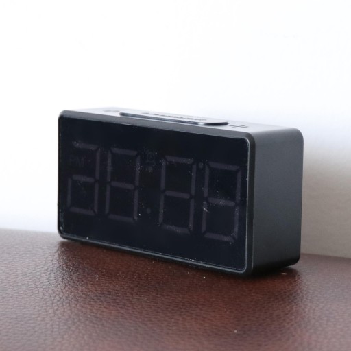 Budzik z wyraźnie zaznaczonym przyciskiem na górze, łatwy do ustawienia czasu lub alarmu