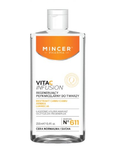 Vita C Infusion No.611 to regenerujący płyn micelarny od marki Mincer Pharma. W skład produktu wchodzi ekstrakt camu- camu, arnika oraz lukrecja.