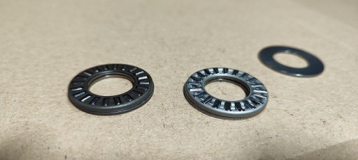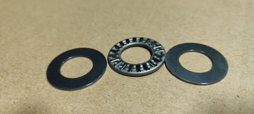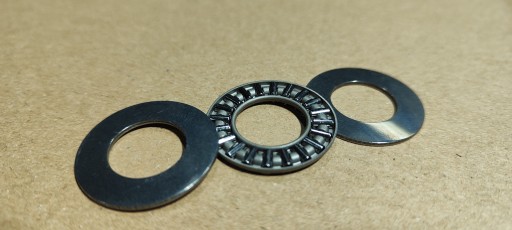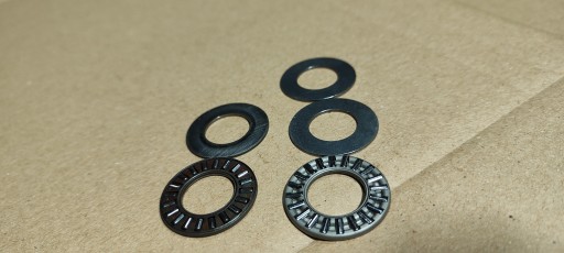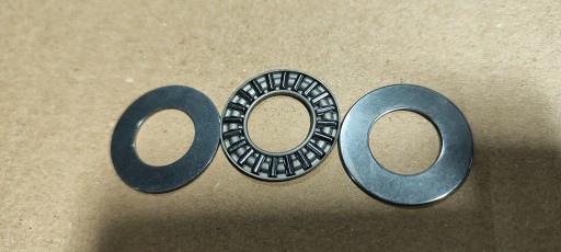 nowe łożysko oporowe sprzęgła - wysprzęglika z dwiema nowymi podkładkami. Łożysko i dwie podkładki nowe- zamiennik japońskiej firmy, pasuje na sworzeń. Jedną tą dodatkową podkładkę można zamontować w przypadku gdy stare łożysko wyrobiło-wytarło otwór w deklu sprzęgła i powstało zagłębienie. Podkładka powinna wyrównać zagłębienie w deklu i utrzymać dłużej w sprawności nowe łożysko.