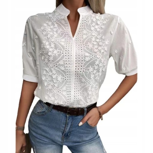 MODNA BLUZKA DAMSKA ELEGANCKA KOSZULA LATO KORONKOWA AŻUROWA W KWIATY BIAŁA