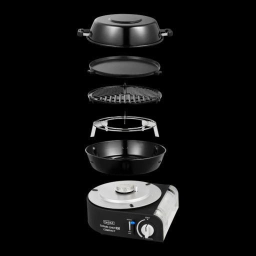 Pomimo niewielkich rozmiarów, Safari Chef Compact jest niezwykle wszechstronny dzięki różnym powierzchniom do gotowania: podstawka na garnek, ruszt do grillowania oraz garnek/pokrywka. Na podstawce można łatwo ugotować garnek zupy lub makaronu. Ruszt do grillowania i blacha do pieczenia mają powłokę CADAC GreenGrill i są idealne do pieczenia i grillowania mięsa, ryb i warzyw. Pokrywka jest wielofunkcyjna, może być również używana jako garnek na zupę.
