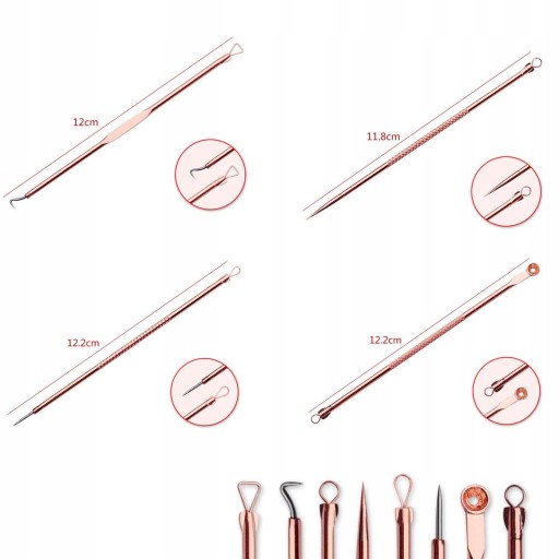 Te praktyczne narzędzia kosmetyczne pomagają łatwo usunąć zaskórniki, trądzik i różne niedoskonałości; wykresy są dostarczane, aby jasno zrozumieć użycie każdego narzędzia.