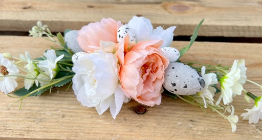 - bogata dekoracja kwiatowa w odcieniach ecru i brzoskwini,