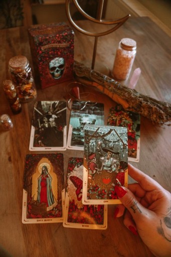 ✨Każda karta w talii reprezentuje aspekty życia, śmierci i odrodzenia, odzwierciedlając mistyczną energię i symbolikę Santa Muerte.