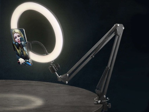 Lampa pierścieniowa LED 10" to idealny gadżet do salonów kosmetycznych, salonów fryzjerskich czy do użytku domowego podczas nagrywania filmów / fotografowania twarzy. W zestawie znajduje się również statyw, który możemy zamontować na blacie biurka lub stołu o maksymalnej szerokości 5.5cm. Zbudowany jest w konstrukcji dwuczęściowej i pozwala na jeszcze lepsze sterowanie układem położenia lampy.