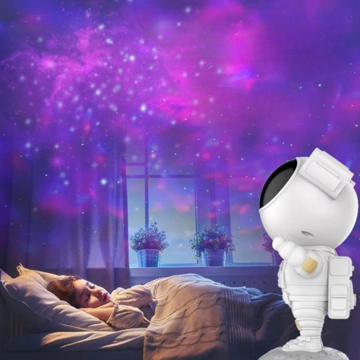 Projektor gwiazd i galaktyk w kształcie astronauty to efektowny gadżet. Rzutnik wyświetla kolorowe i ruchome wzory galaktyk oraz laserowe gwiazdy.