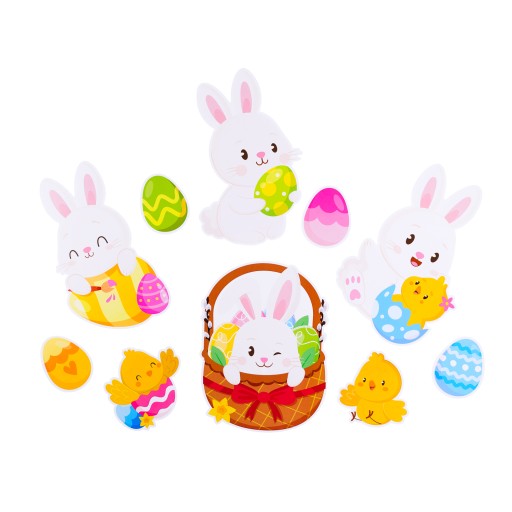 Zestaw składa się z 4 dużych zajączków, 4 pisanek oraz 2 kurcząt - idealny zestaw do Wielkanocnej dekoracji szkoły i przedszkola.
