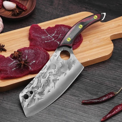 Ostrze wykończone młotkiem, proces jest pracochłonny i daje bardzo mocny efekt. Ultra ostre ostrze z efektem nieprzywierającym. Ostrze z otworem, w którym można je pewnie trzymać palcem wskazującym, co oszczędza wysiłek. Pełna rękojeść mocno wzmocniona 3 nitami , projekt zapewniający długą żywotność.