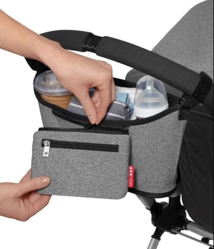 Wychodząc na rodzinny spacer nie zawsze chcemy zabrać cały arsenał rzeczy "na wszelki wypadek ". Wygodny w prowadzeniu wózek i multifunkcjonalny organizer w takich sytuacjach sprawdzi się fenomenalnie. Organizer do wózka SKIP HOP GRAB & GO to niezwykle praktyczny gadżet. Przestronna kieszeń główna pomieści wszystkie niezbędne rzeczy - zabawkę, smoczek, chusteczki, napój i przekąskę. Bardziej wartościowe przedmioty - telefon, portfel lub klucze - schować można w mniejszej, zapinanej na zamek, kieszonce. Jeśli zajdzie taka potrzeba - w sklepie lub na placu zabaw - wystarczy odpiąć kieszonkę od organizera i korzystać z niej jak z podręcznej torebki. Kieszonka-torebka ma jeszcze jedną niespodziankę, którą w szczególności docenią melomani - specjalny port dla słuchawek. Neutralny kolor oraz uniwersalny system mocowania (paski z rzepami), sprawia, że Organizer pasował będzie do każdego wózka.