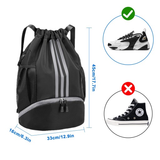 🥎 【POsortowane przegródki】: przechowuj dodatkową parę butów treningowych w dolnej komorze torby gimnastycznej, otwory wentylacyjne wspomagają przepływ powietrza i zapewniają świeżość. W przedniej komorze zmieści się większość piłek do koszykówki, piłek i kasków, dzięki czemu nie wymaga użycia rąk i idealnie nadaje się do treningów i uprawiania sportów na świeżym powietrzu.