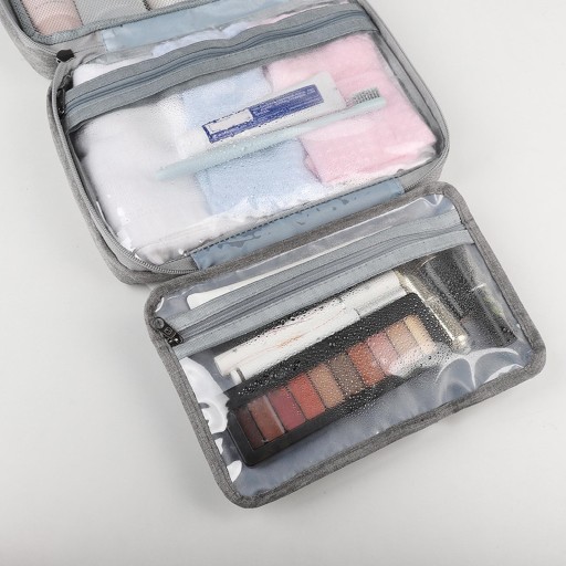 Specjalna konstrukcja: oddzielna komora sucha i mokra, wiszący organizer na przybory toaletowe, wodoodporny przezroczysty PVC, wysokiej jakości zamek błyskawiczny, bardzo duża pojemność, mocny materiał