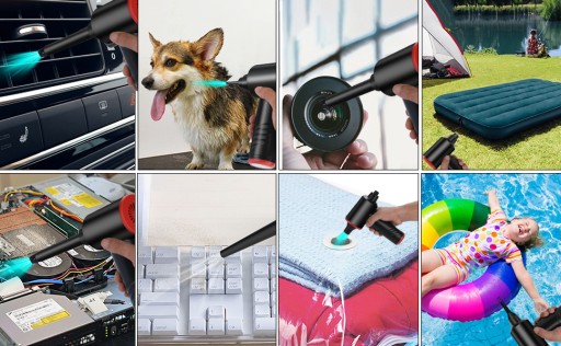 - Oprócz odkurzania obudów komputerów, klawiatur, wnętrz samochodów, okien z kwiatami lilii i nie tylko, można go również używać z innymi wielofunkcyjnymi nasadkami do pompowania, takimi jak koła do pływania, dmuchane materace, nadmuchiwane poduszki, worki do przechowywania próżniowego, piłki do jogi i dmuchane zabawki.