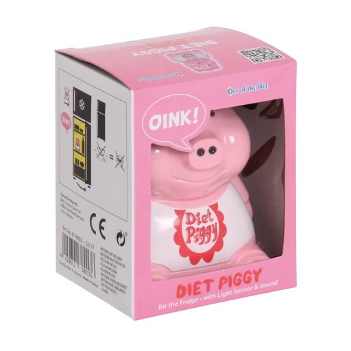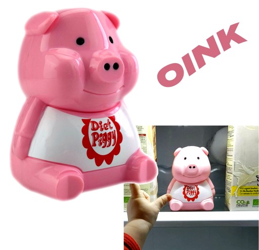 Świnkę montuje się na drzwiach lodówki lub można ją postawić na półce w lodówce. Za każdym razem, kiedy otworzysz lodówkę, by coś przekąsić, Świnka będzie kwiczeć do czasu, aż zamkniesz lodówkę. Przeraźliwe i zabawne dźwięki wydobywające się ze świnki będą przypominać ci o złożonym sobie przyrzeczeniu, aby nie podjadać między posiłkami.