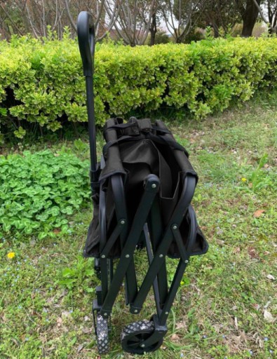 Wykonany z metalowej ramy oraz wodoodpornego materiału, posiada wygodną rączkę ułatwiającą prowadzenie wózka.