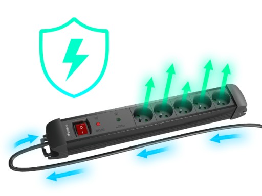Listwa Lanberg SP1-05E-0150-BK wykorzystuje topikowy bezpiecznik automatyczny 10 A z maksymalnym obciążeniem 2500 W i niezwykle szybkim czasem reakcji, wynoszącym tylko 10 nanosekund. Ta funkcja przeciwzwarciowa gwarantuje natychmiastową reakcję na wszelkie niebezpieczne zmiany w przepływie prądu, chroniąc Twoje urządzenia oraz sieć elektryczną przed potencjalnymi uszkodzeniami. Listwa zasilająca posiada m.in podświetlany wyłącznik bezpieczeństwa, pięć gniazd sieciowych z uziemieniem oraz wbudowane przesłony torów prądowych. Dioda LED informuje użytkownika o aktualnym stanie ochrony, co jest praktycznym dodatkiem podwyższającym funkcjonalność listwy Lanberg.