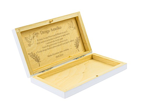 W naszej najnowszej ofercie prezentujemy unikatowe drewniane pudełko na pieniądze, idealne na prezent z okazji Pierwszej Komunii Świętej. Wykonane z ekologicznych materiałów, ozdobione pięknym drukowanym motywem, wprowadza niepowtarzalny klimat i dodaje osobistego charakteru. Do jego wnętrza można łatwo włożyć banknoty, a wygrawerowane indywidualne życzenia sprawią, że tradycyjna kartka z życzeniami stanie się zbędna.