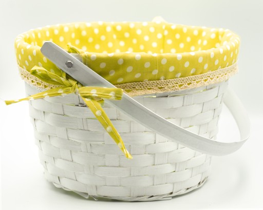 Wiklina to ponadczasowy materiał wprowadzający we wnętrze przytulny, domowy klimat. Prezentowany przez nas koszyk dodatkowo jest pomalowany na kolor biały, co nadaje mu uniwersalnego i lekkiego uroku. Dodatkowo ozdobiony jest materiałowym żółtym pokryciem wewnątrz w drobne białe kwiatki. Po bokach posiada dwie delikatne kokardki. Materiał można zdjąć i w razie potrzeby wyprać.