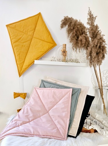 Latawiec na ścianę wykonany z tkaniny bawełnianej. Ozdobiony 3 kokardkami Idealnie nadaje się do codziennych zabaw oraz jako element dekoracyjny pokoju dziecięcego.