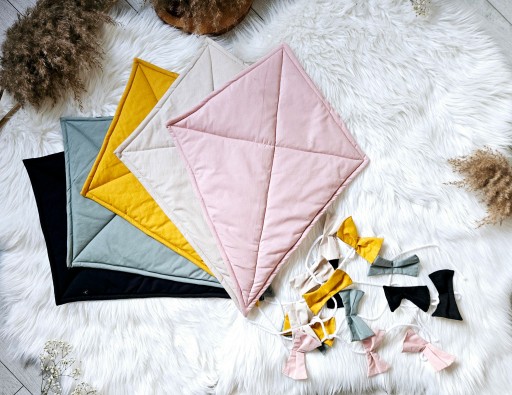 Latawiec na ścianę wykonany z tkaniny bawełnianej. Ozdobiony 3 kokardkami Idealnie nadaje się do codziennych zabaw oraz jako element dekoracyjny pokoju dziecięcego.