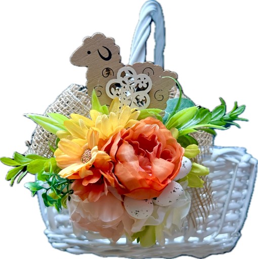 - w skład dekoracji wchodzą dodatki zielone, kwiaty, jajeczka i baranek,