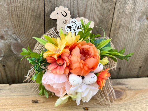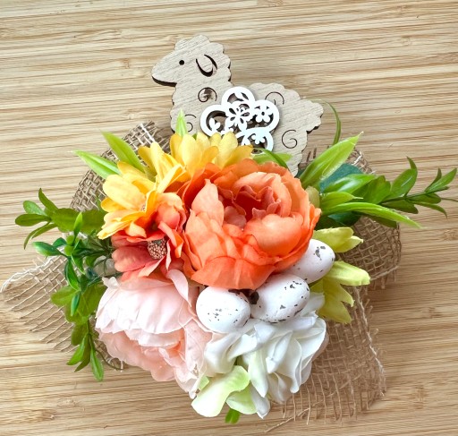 - w skład dekoracji wchodzą dodatki zielone, kwiaty, jajka i baran,