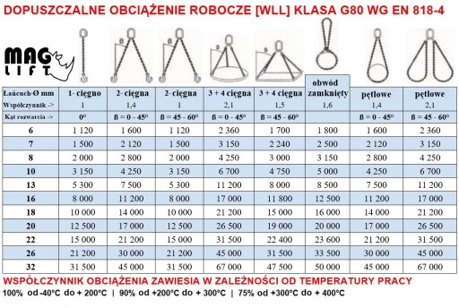 WYKONANIE: zawiesie łańcuchowe 4-cięgnowe wyprodukowanie wg PN-EN 818-4 z atestowanych komponentów i łańcucha zawiesiowego o wytrzymałości na rozciąganie 800 N/mm2 / GR8 / i spełniające wymagania Dyrektywy Maszynowej 2006/42/WE wyd. maj 2006. Badania typu przeprowadzono z procedurą dla producenta, na maszynie wytrzymałościowej .