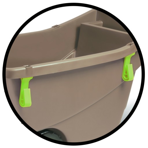 - Dużym ułatwieniem w pracy jest wbudowana wewnątrz misy praktyczna półeczka, możemy w niej przewozić doniczki lub sadzonki, a nawet w komfortowych i higienicznych warunkach kanapki i termos z herbatą.