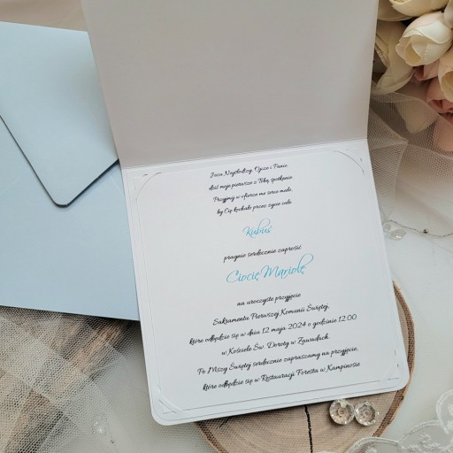W środku personalizowany tekst zaproszenia, z imieniem dziecka, danymi uroczystości oraz zaproszonymi gośćmi.