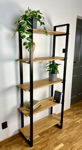 Blaty regału wykonane są z litego drewna dębowego, zabezpieczone olejem lnianym.