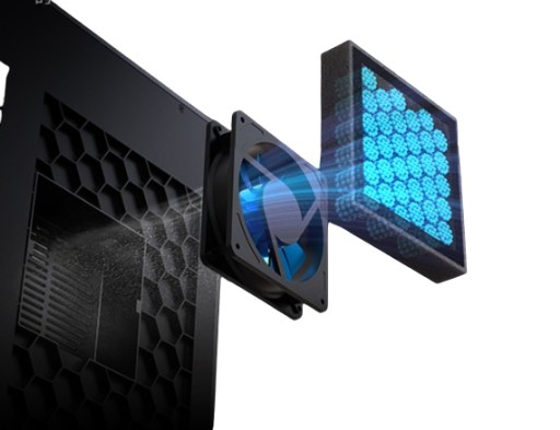 Głowica drukująca K1 posiada mocny wentylator promieniowy, który zapewnia dwustronne chłodzenie komponentów, a tym samym chłodzi świeżo wydrukowane warstwy bezpośrednio z dwóch stron. Wentylator obudowy o mocy 18 W dodatkowo zwiększa efekt chłodzenia.