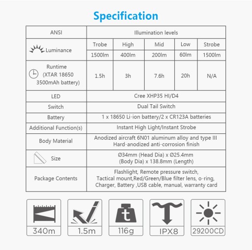 Xtar TZ28 to wysokiej jakości taktyczna latarka z oryginalną diodą Cree XHP35 oferująca światło o mocy 1500 lumenów i zasięgu 340 metrów. Precyzyjnie wykończona, doskonale spasowana obudowa latarki TZ28 została wykonana z wysokiej jakości stopu aluminium lotniczego 6N03 typ III odpornego na upadki z wysokości 1,5m. Dodatkowo całość została pokryta środkiem antykorozyjnym. Konstrukcja została uszczelniona w 4 miejscach o-ringami zapewniającymi stopień ochrony IPX8 (wodoszczelność do 2m). Wysokiej jakości kontakty i dwie sprężyny zapewniają bardzo dobry styk akumulatora i wysoką odporność na wstrząsy.