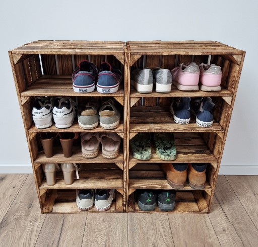 Skrzynki są jednakowej wielkości co sprawia, że można z nich ustawiać półki na buty, regały na książki, eksponować zabawki.