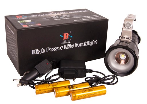 Latarka działa przy użyciu trzech bardzo mocnych akumulatorów. Akumulatory znajdują się w zestawie. Można je ładować bezpośrednio z sieci bądź w samochodzie.