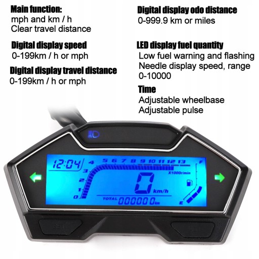 4. Cyfrowy wyświetlacz prędkości (0-199 km/h lub mph), odległości (0-999,9 km lub mil) i odległości odo (0-99999,9 km lub mil).