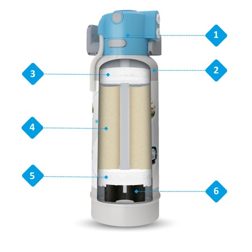 - Zawartość opakowania: 1x bateria jednodrożna, 1x wkład filtrujący D-1, 1x głowica wkładu filtrującego wodę, 1x elektroniczny wskaźnik LED wymiany wkładu filtrującego, 1x uchwyt do montażu filtra wody na ścianie, 1x trójnik z zaworem, 1x elastyczny wężyk (200 cm), 1x adapter, 1x pasek do badania twardości wody