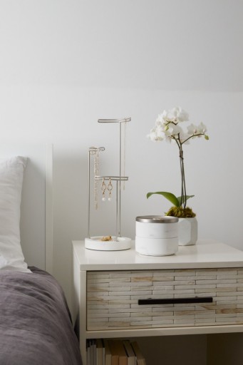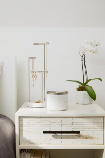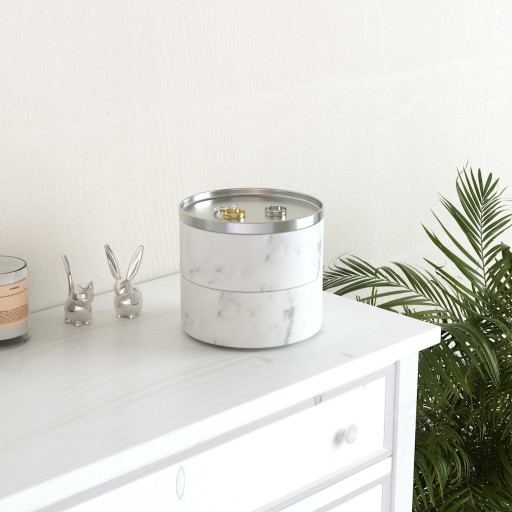 Całość składa się z dwóch pojemników z wyścielonym miękkim materiałem dnem oraz przykrywki, na którą odłożysz mniejszą biżuterię.