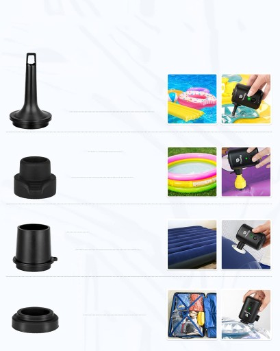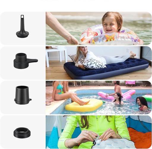 🏄️ -Dzięki 4 różnym dyszom ta pompa powietrza może spełnić Twoje wymagania, szeroko stosowana do poduszek powietrznych, materacy, nadmuchiwanych basenów, kółek do pływania, brodzików dla dzieci, piłek do jogi, balonów i innych nadmuchiwanych przedmiotów.