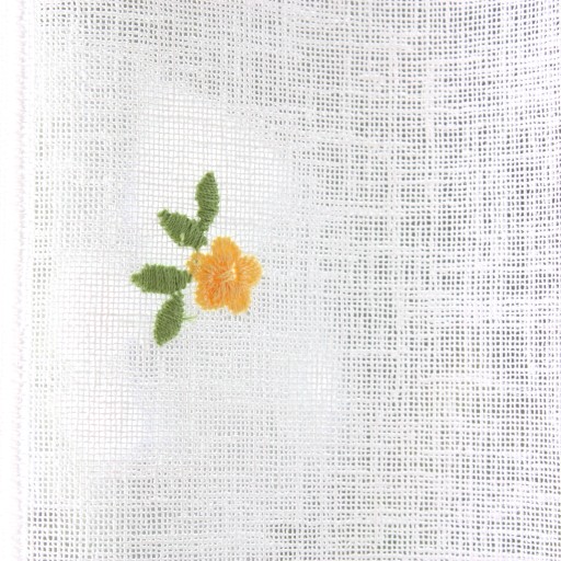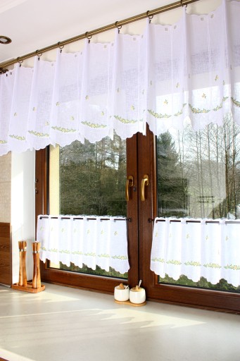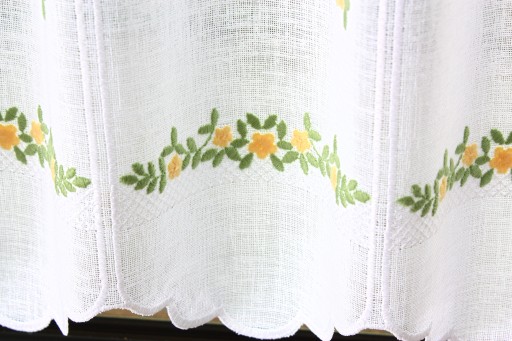 Przedmiotem sprzedaży jest biała firanka typu zazdrostka . Tkanina do złudzenia przypomina naturalny len przyozdobiony delikatnym haftem w kwiatuszków kolorze żółtym z zielonymi listeczkami , takie zestawienie obłędnie wygląda w oknie. .