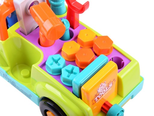 Wielofunkcyjna, edukacyjna zabawka dla małych majsterkowiczów. Samochód majsterkowicz z narzędziami dla maluszka. Zabawka potrafi samodzielnie jeździć, zmieniając za każdym razem kierunek, kiedy napotka przeszkodę. Autko może być również sterowane samodzielnie przez dziecko. W trakcie jazdy gra wesoła muzyczka (można ją wyłączyć), migają przednie światła. Świetna zabawka dla najmłodszych mechaników samochodowych, majsterkowiczów. Bardzo kolorowa i starannie wykonana.