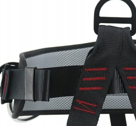 Pas bezpieczeństwa do wspinaczki: Z boku uprzęży znajdują się 2 haczyki na sprzęt i 2 pierścienie D, haczyki na sprzęt są bardzo trwałe i łatwe do zawieszenia innego sprzętu wspinaczkowego Pierścienie D o wysokiej wytrzymałości chronią Cię podczas wspinaczki Wytrzymała czarna klamra umożliwia szybką i łatwą regulację pasa biodrowego i udowego