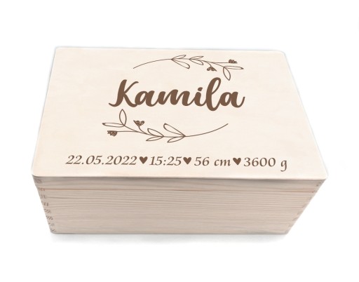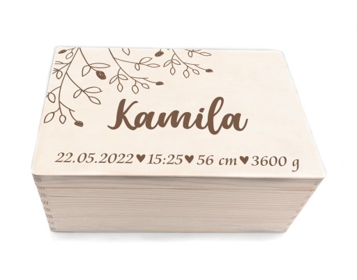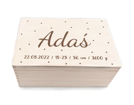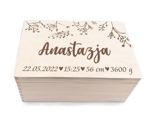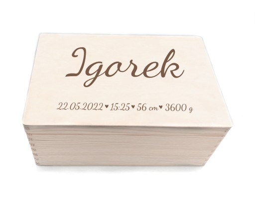 Personalizowana drewniana skrzynka, świetnie się sprawdzi na prezent z okazji narodzin dziecka, urodzin, Chrztu Świętego, roczku itp. Może służyć do przechowania zabawek, skarbów dziecka, zdjęć i innych pamiątek, upamietniających chwile z dzieciństwa.