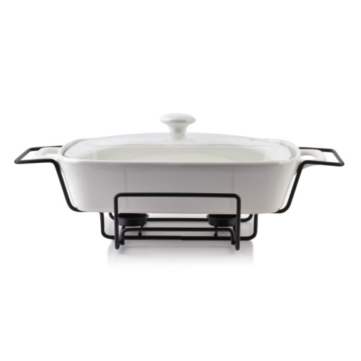 Piękne naczynie na stojaku z funkcją podgrzewania za pomocą świeczek to świetne rozwiązanie gdy chcemy podać potrawę podczas przyjęcia. Danie w naczyniu będzie długo ciepłe i smaczne.