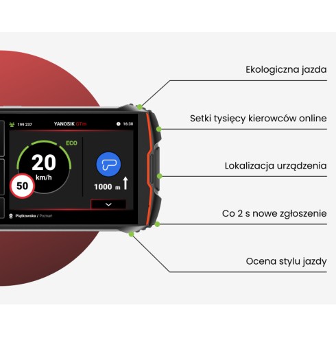 Yanosik GTm to kompaktowe, dotykowe, urządzenie ostrzegające o zdarzeniach na trasie. Zamontuj je w swoim aucie i zyskaj:
