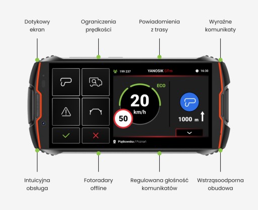 Yanosik GTm obsługujesz dotykowo, dzięki czemu interakcja z urządzeniem jest znacznie płynniejsza. Możesz dodawać swoje zgłoszenia łatwo i przyjemnie przez panel dotykowy.