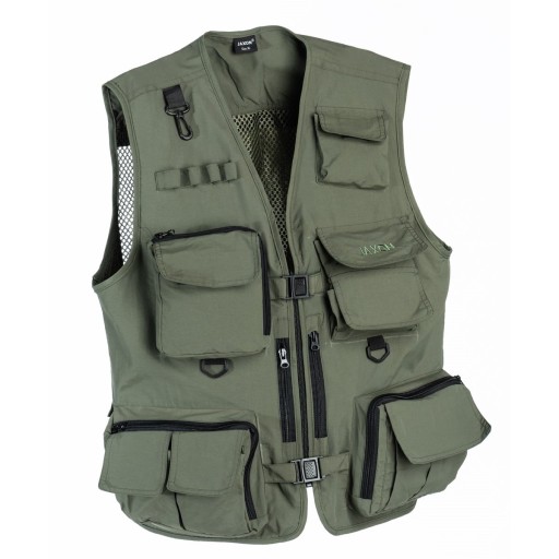 Kamizelka to nie tylko element stroju wędkarza. To również przybornik, bo w kieszeniach można zmieścić cały arsenał drobiazgów niezbędnych na łowisku.