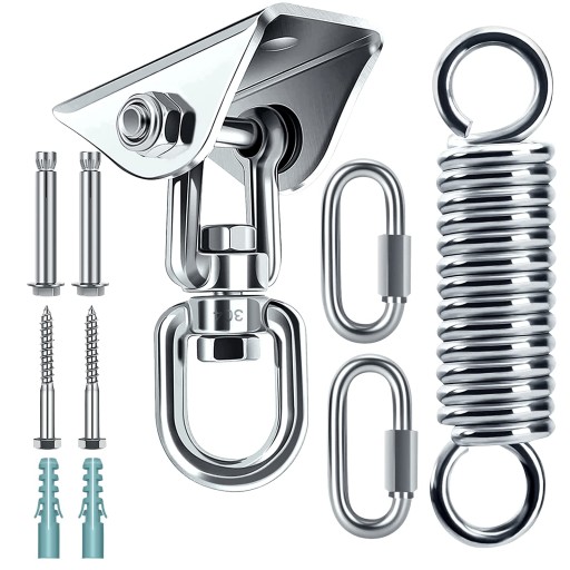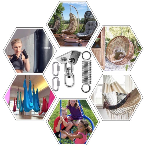 Hak sufitowy o nośności do 450 kg, obracany o 360 °. Duże obszary zastosowania – do użytku wewnątrz i na zewnątrz można go używać do: fotel wiszący, lampy wiszące, hamak, worek bokserski, chusta do noszenia, chusta do jogi, żagla przeciwsłonecznego, chusta do noszenia, fotel wiszący, fotel wiszący itd.